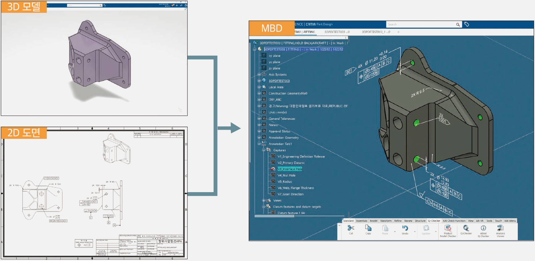 MBD(모델 기반 정의)는 제품 설계와 제조 정보를 3D 모델 자체에 포함시키는 방식이다. 제품을 입체적으로 이해할 수 있는 3D 모델과 2D 도면에서 제공되는 정보를 하나로 통합해 제공하는 형태로, 기존 다양한 형태의 2D 도면을 대체해 하나의 3D 모델만을 사용해 모든 정보를 전달할 수
