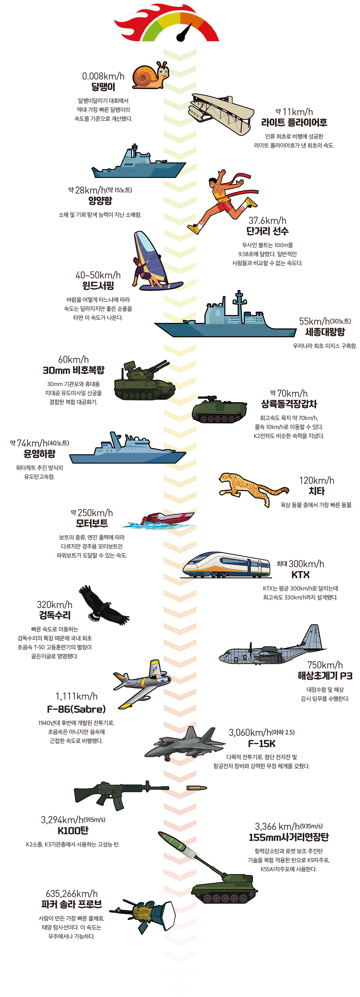 Home UNIT.1 단위그래픽 링크 복사하기 지금은 전력 질주 중 속도의 증가는 생존과 관련 있는 중요한 요소다. 생물을 비롯해 무기체계는 속도 경쟁에서 꾸준히 진화해 왔다. 아래 각 속도는 평균 수치로 표기했다.